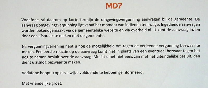 *De afspraak met MD7/Vodafone tijdens hun informatieavond op 2 maart was, dat alle bewoners een brief zouden ontvangen. Wij hebben vernomen van een aantal inwoners dat zij inderdaad een brief hebben ontvangen, maar weten niet of het ALLE inwoners betreft.